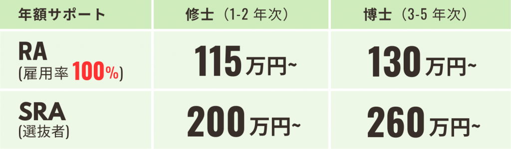 *当グループでは、アカデミア研究者の待遇を改善する研究室独自の取り組みとして、月額8~10万円程度の給与増額に継続的に取り組んでいます。(学振PD採択者の適性を見定めて当グループの研究プロジェクトに関わってもらい、そこから給与の支払いを行っています)