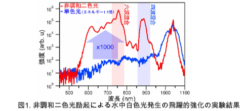 水中で広帯域の光を生成するスーパーコンティニューム生成を、周波数比が整数でない「非調和二色光」により劇的に増強することに成功しました!