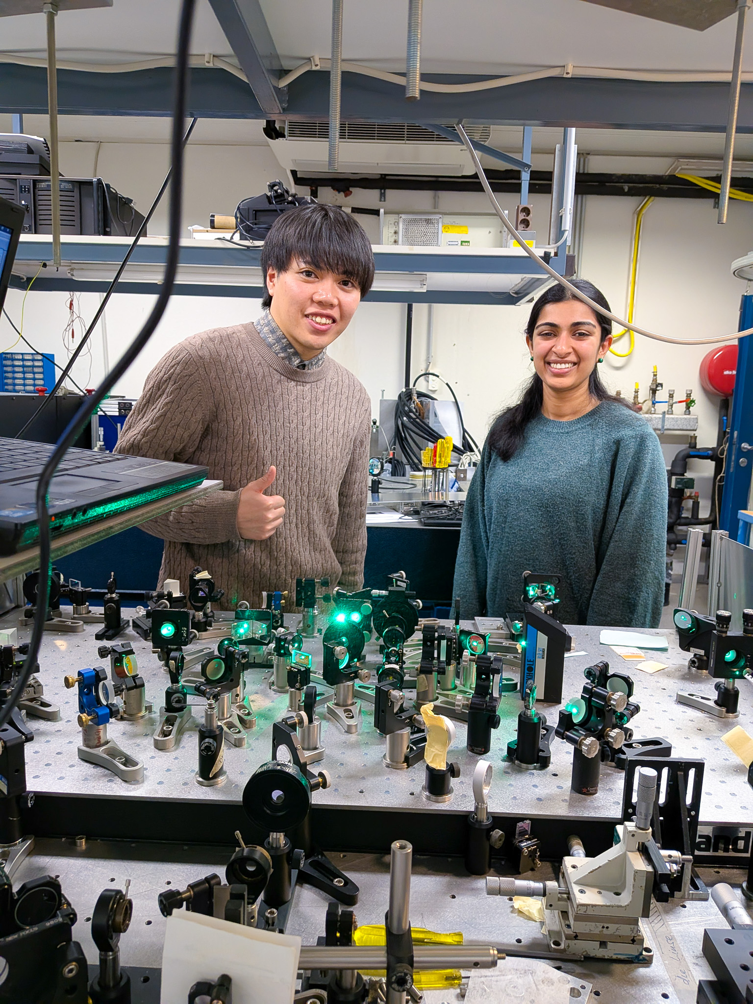 光学実験系などを前に、非線形結晶やビームの配置、ビーム品質の評価、バーストモー