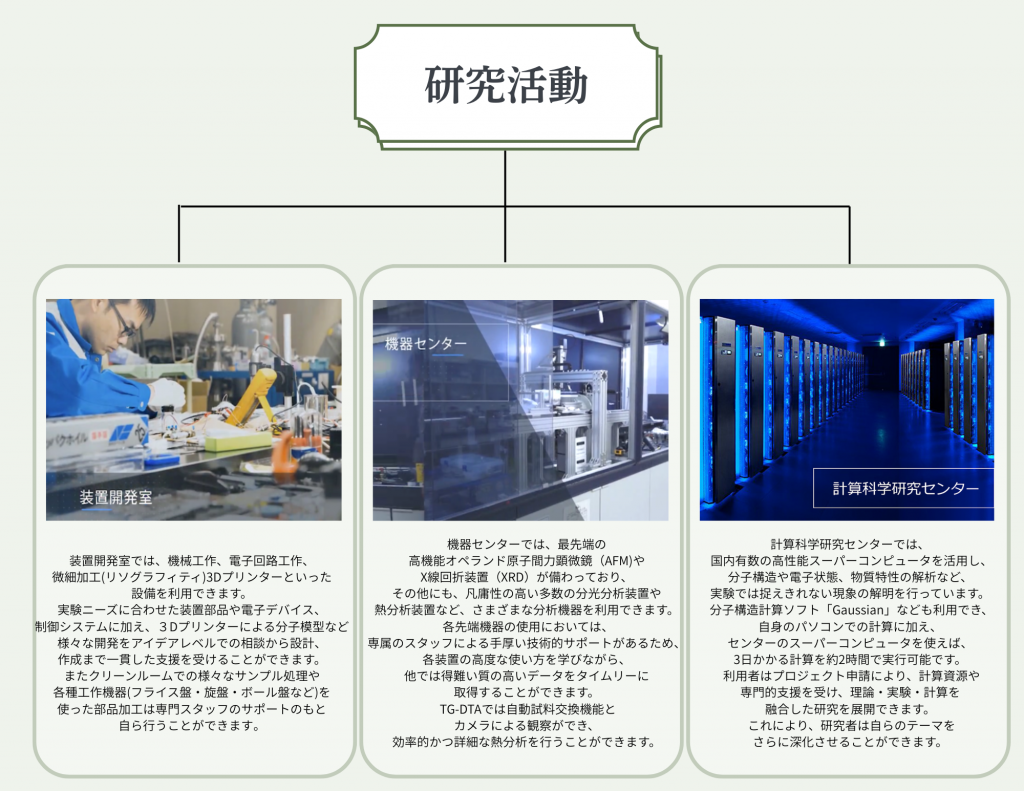 A. 分子科学研究所は日本の共同利用研究拠点として設立された経緯があります。そのため、『機器センター』や『装置開発室』『計算センター』などの先端的施設が併設されていて、これらの施設を非常に身近に利用することができます。これらの共同利用施設と研究室の先鋭的な研究設備を駆使することで、他では実施が難しいような挑戦的で分野融合的な研究取り組みや刺激的な研究にクリエイティブに取り組むことができる研究環境が整っています!
